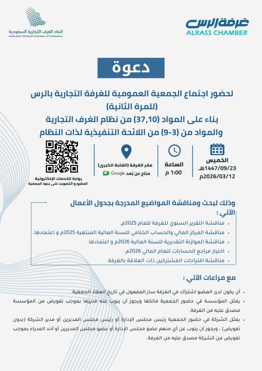نظراً لعدم اكتمال النصاب القانوني تقرر تأجيل موعد انعقاد الجمعية العمومية العادية للعام 2025م إلى يوم الخميس 1447/09/23هـ الموافق 2026/03/12م الساعة 1 ظهراً في مقر الغرفة و عن بعد